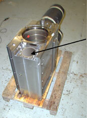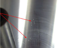 Inspection of the borehole (left, black arrow) reveals surface defects and porosity (right, red arrows), which impair performance and service life.