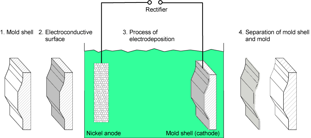 By means of electroforming Nickel is deposited on a mandrel. The coat is free of pores and the thickness can reach several millimeters.