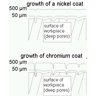 Answer: An electroplated nickel coating has several functions. Nickel serves as a barrier against many corrosive reagents whereas a chromium layer has cracks so that reagents can react with the base material. In addition, nickel is a well bonding basis for chrome. The rough surface of the workpiece will be enhanced by a chromium deposition whereas an electroplated nickel coating will leave a smoother finish. (see figure below).